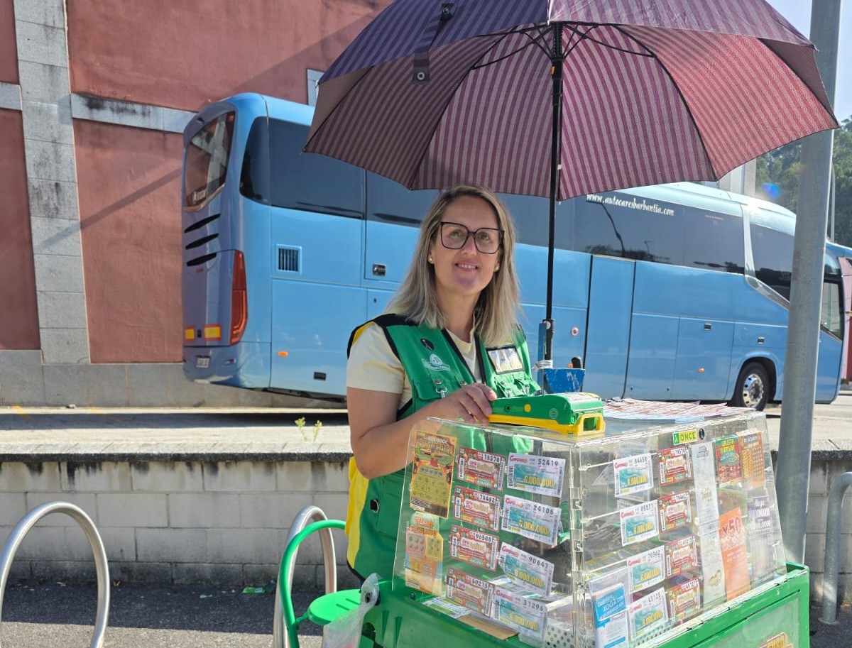 Orden y disciplina. Luce feliz, sonriente, con su mesa expositora de los productos de lotería social, segura, responsable y solidaria de la Organización de ciegos. María Isabel Guzmán Santiso, de Silleda (Pontevedra), que cumplirá los 47 años en noviembre, lleva dos años y medio como agente vendedora. “Estoy supercontenta de estar aquí, en la ONCE”, declara.